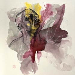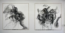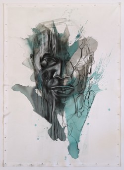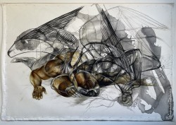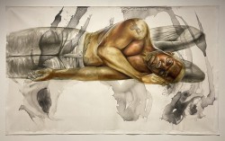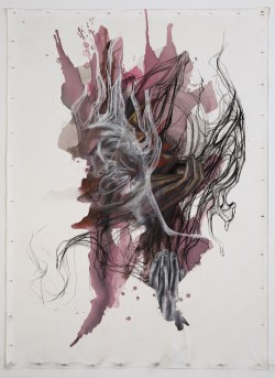 A Conversation with Sparrows, Oil paint, charcoal, and India ink on unstretched canvas, 60 x 120 in, 2022